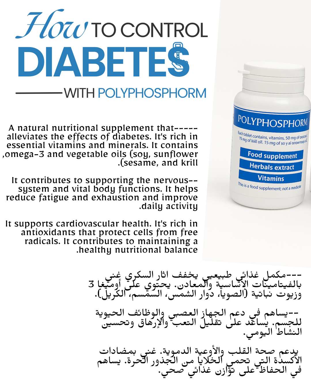 Polyphosphoform is a safe supplement for diabetics that contributes to regulating, lowering and stabilizing blood sugar without any side effects. It also works to cure all symptoms of diabetes, the most important of which are: neuropathy - fatigue - numbness and heat in the extremities - blurred vision - severe lethargy and sexual impotence, because it contains a special natural formula that works to cure all symptoms of diabetes. It also does not cause any symptoms or side effects thanks to its unique and distinctive formula.